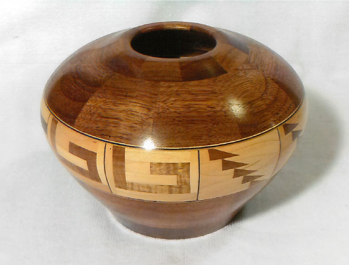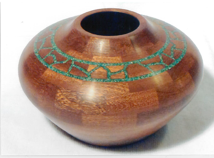 **SOLD** No. 41 $150 / 2016 African Mahogany, Liquid Inlace (85 pieces) 3 1/2" H x 6" Diameter