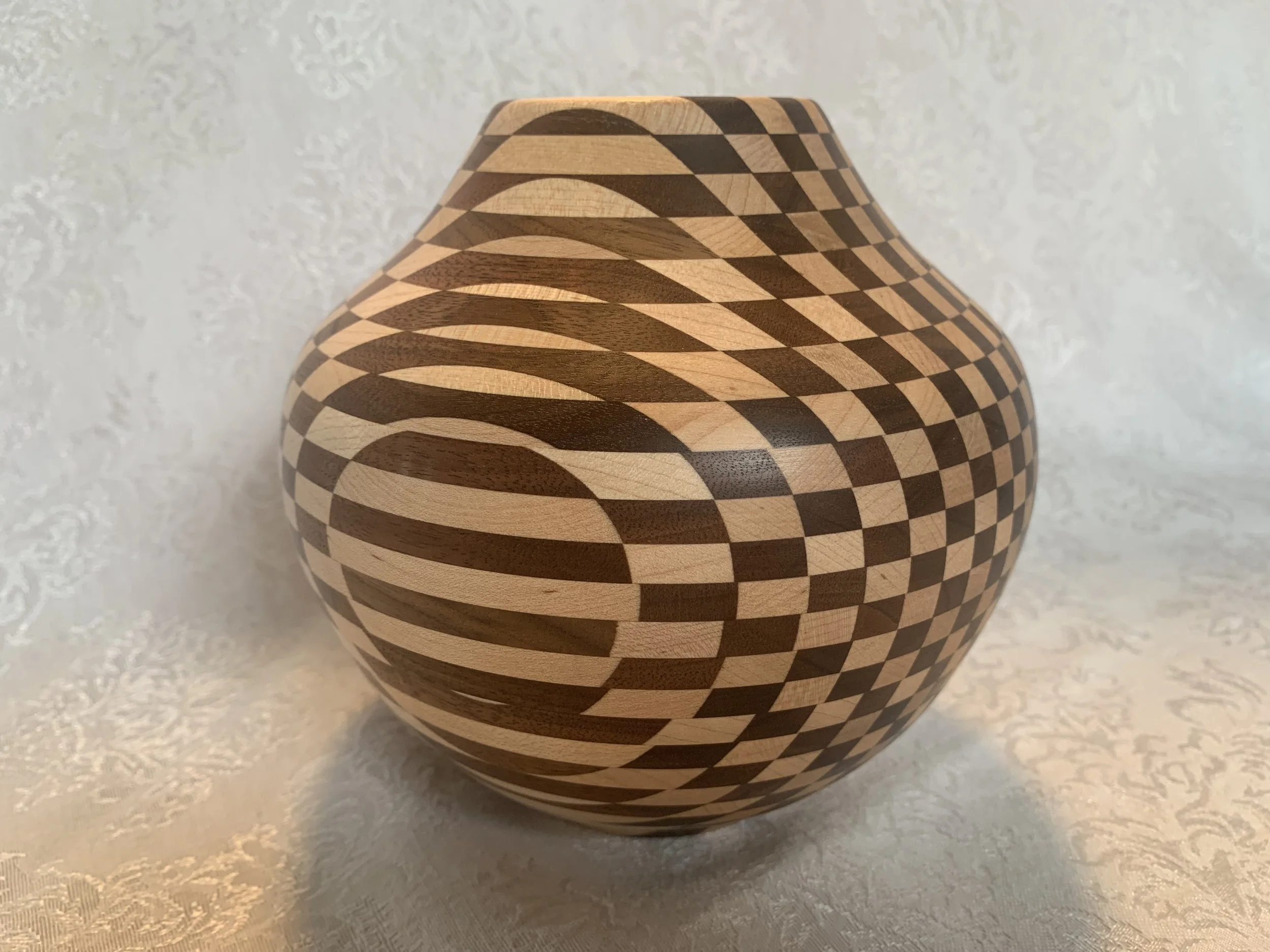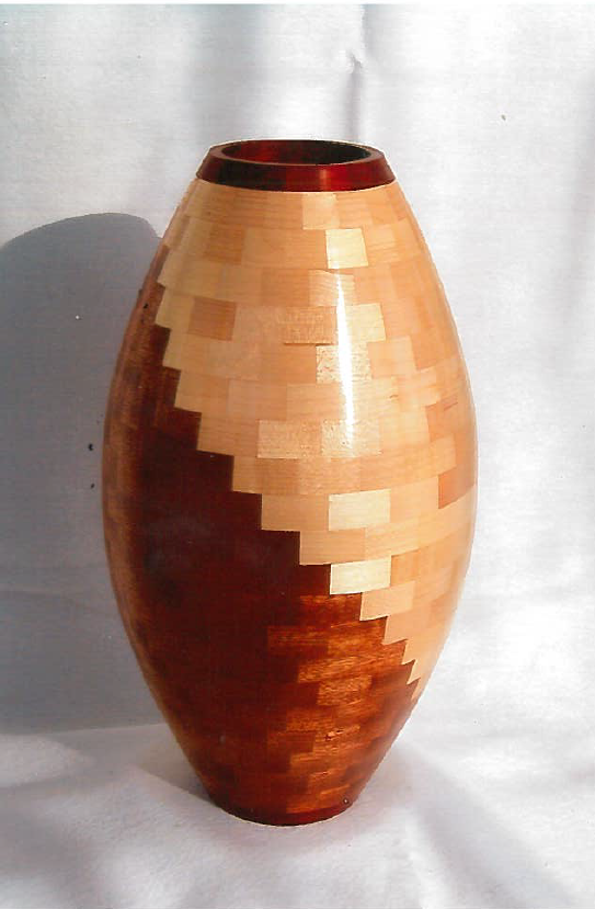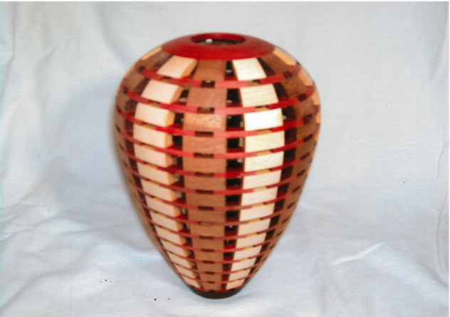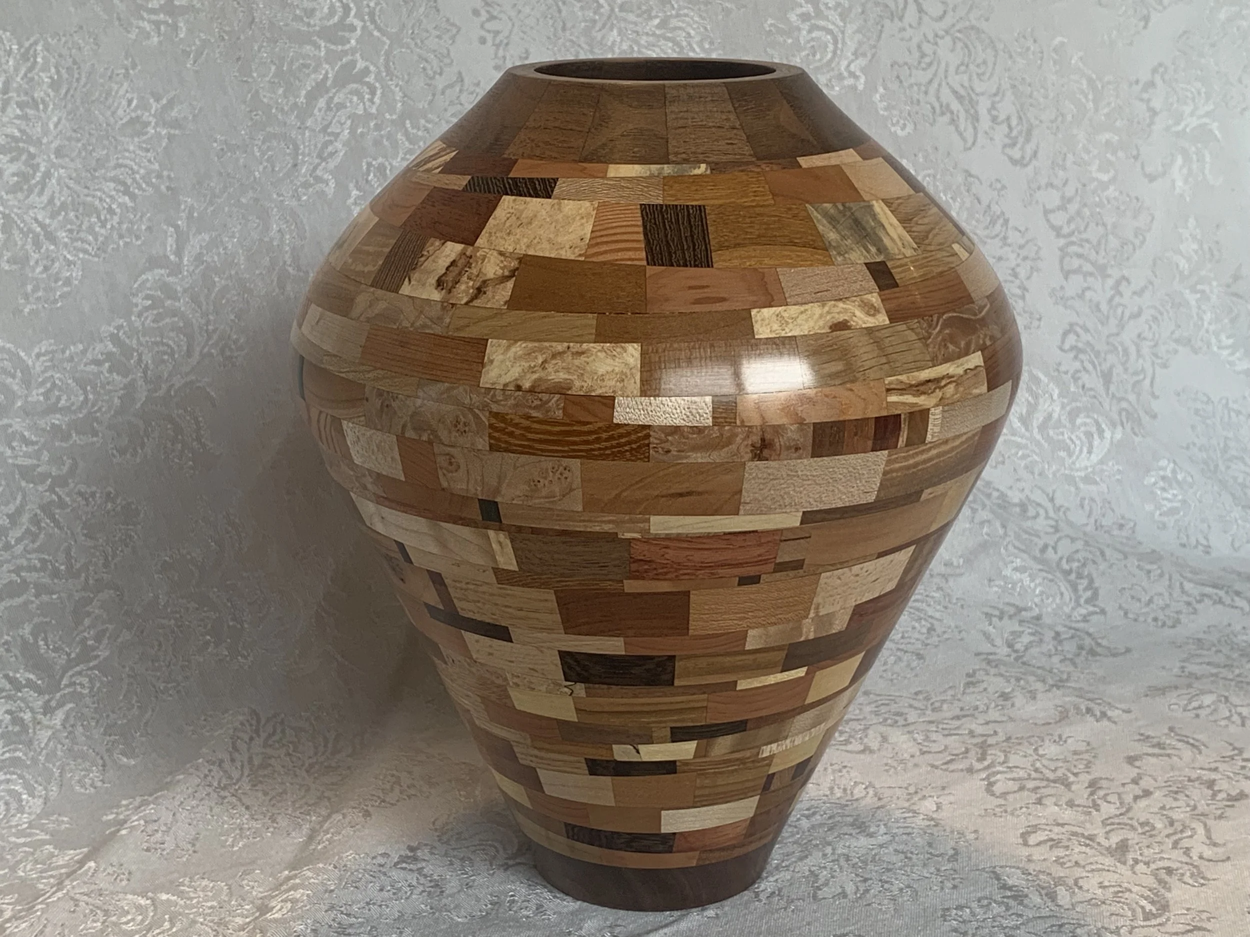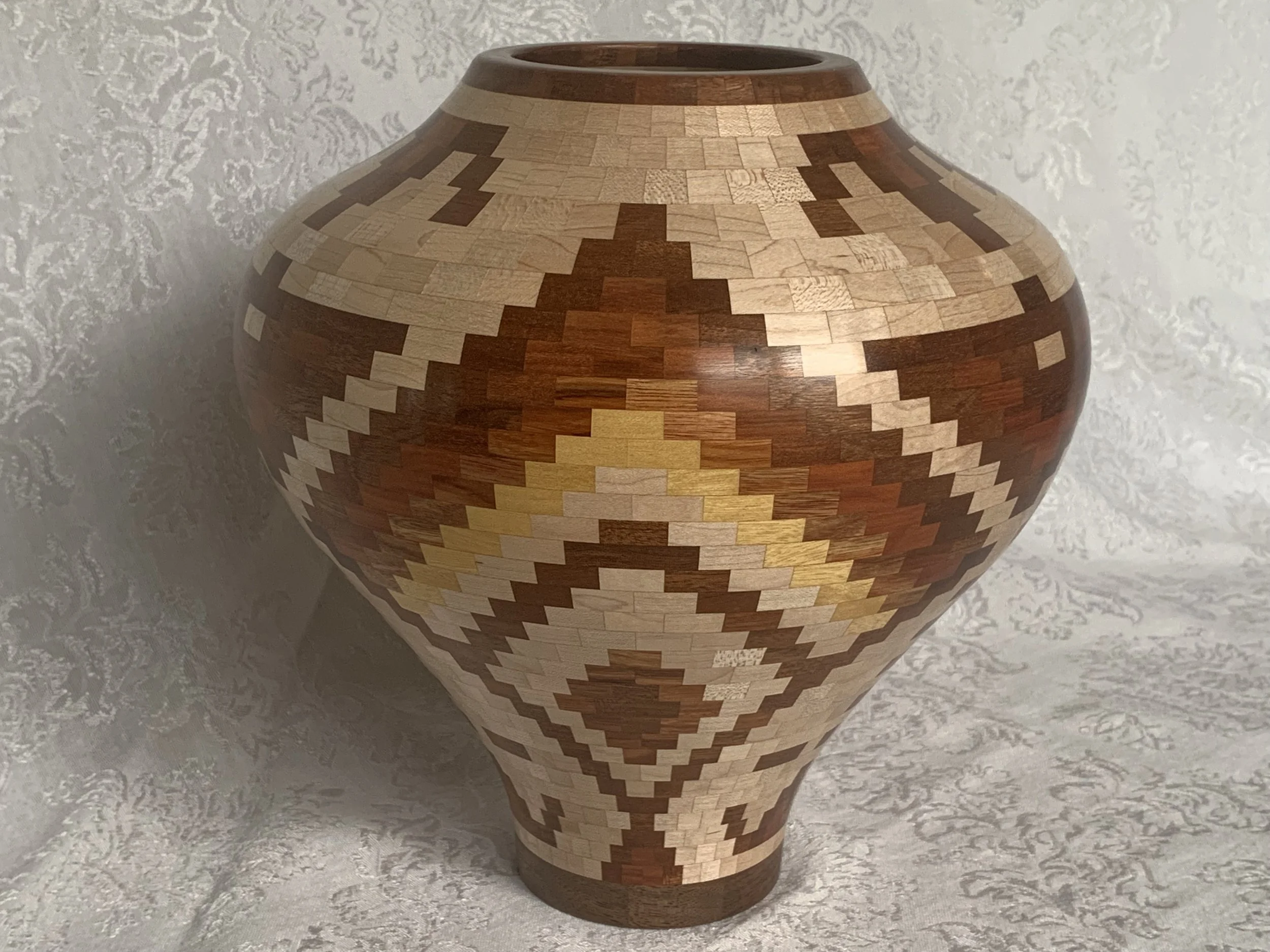 No. 62 $1800 / 2022 Maple, Red Heart, African Mahogany, Canary Wood, Yellow Wood, Walnut (1642 Pieces) 9 H x 8 1/2" Diameter