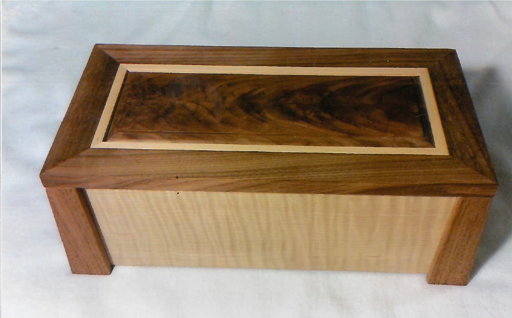Wood Box 4. $100 / 2016 Walnut, Curly Maple, Bookmatched Walnut Crotch, Yellow Heart Hinges 5 3/4 x 11 1/8 x 4 1/2 H
