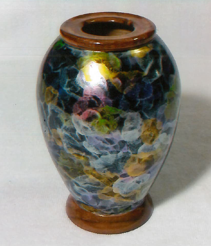 **SOLD** No. 47 $150 / 2017 Walnut, Madrone Burl, Yellow Heart, Maple, Dyed Veneer (91 Pieces) 3 1/2 H x 6" Diameter