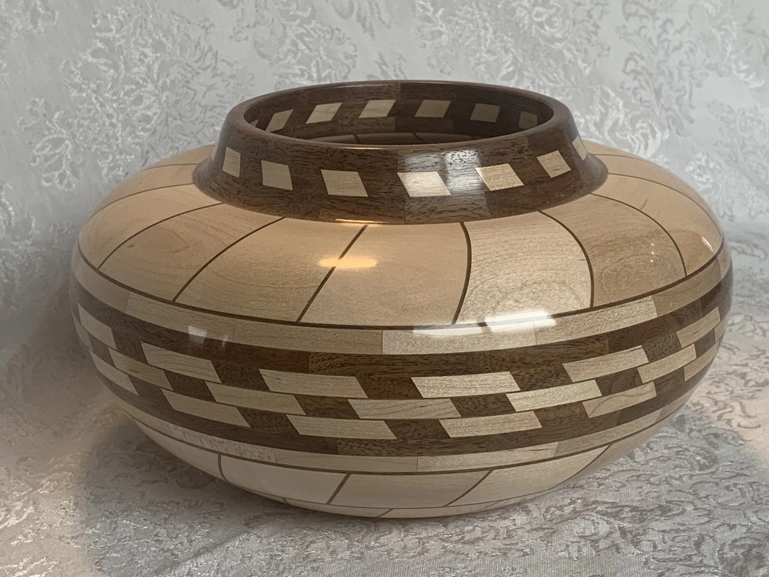**SOLD** No. 48 $150 / 2017 Walnut, Maple (320 pieces) / 6 1/4" H x 7 1/2" Diameter