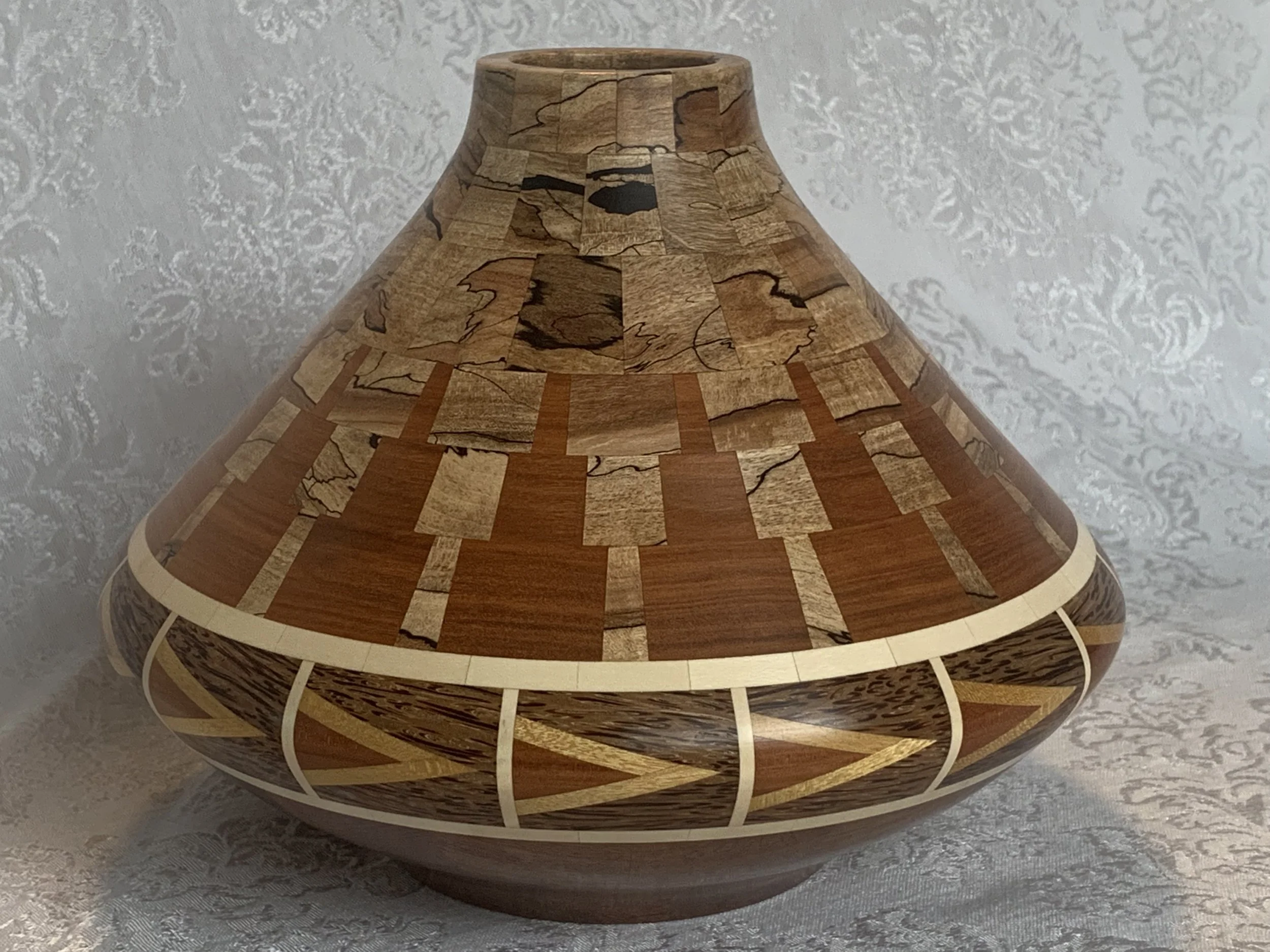 **SOLD** No. 54 $1000 / 2020 Spalted Maple, Red Heart, Red Palm, Yellow Heart, Holly, African Mahogany, Maple (321 Pieces) 6 3/4 H x 8 1/4" Diameter