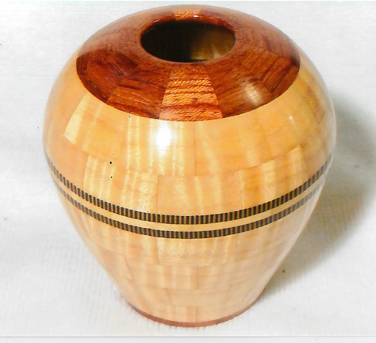 **SOLD** N0. 19 $200 / 2013 Bubinga, Roasted Curly Maple, Bloodwood, Yellow Heart, Black Dyed Maple Veneer (217 Pieces) 8" H x 8" Diameter